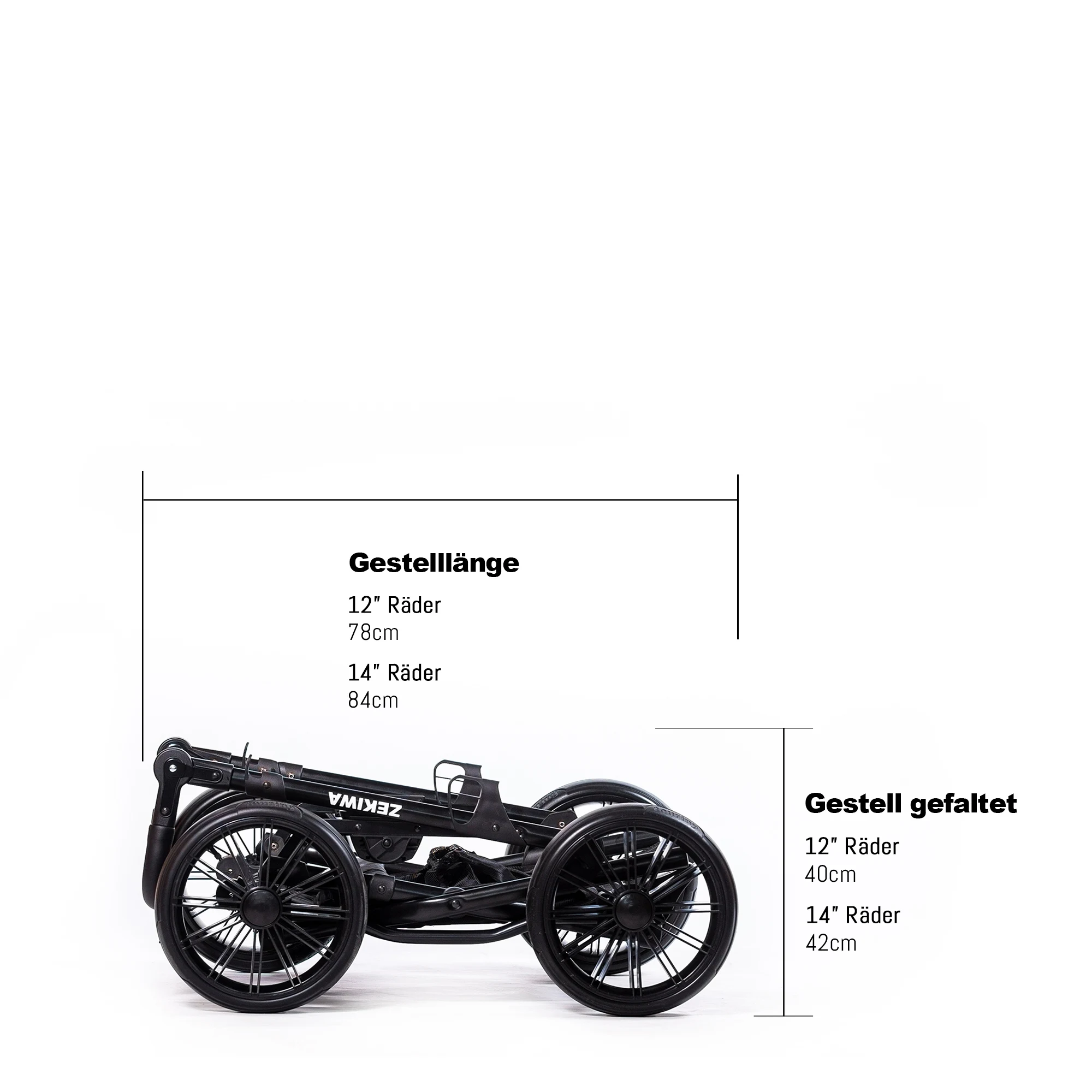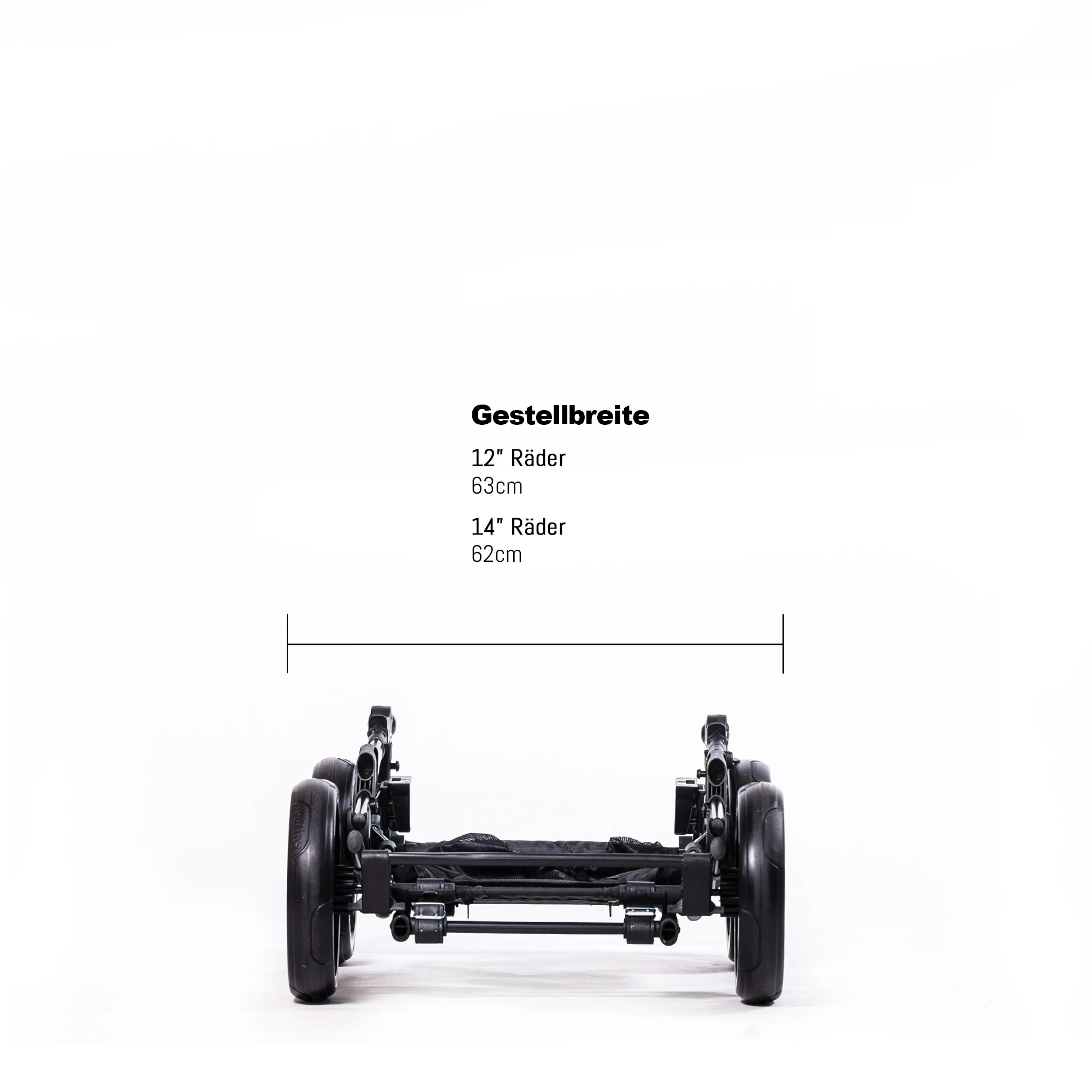 Luft- oder Gelräder (12 Zoll), kugelgelagert für ruhige Fahrten ohne Pannen.