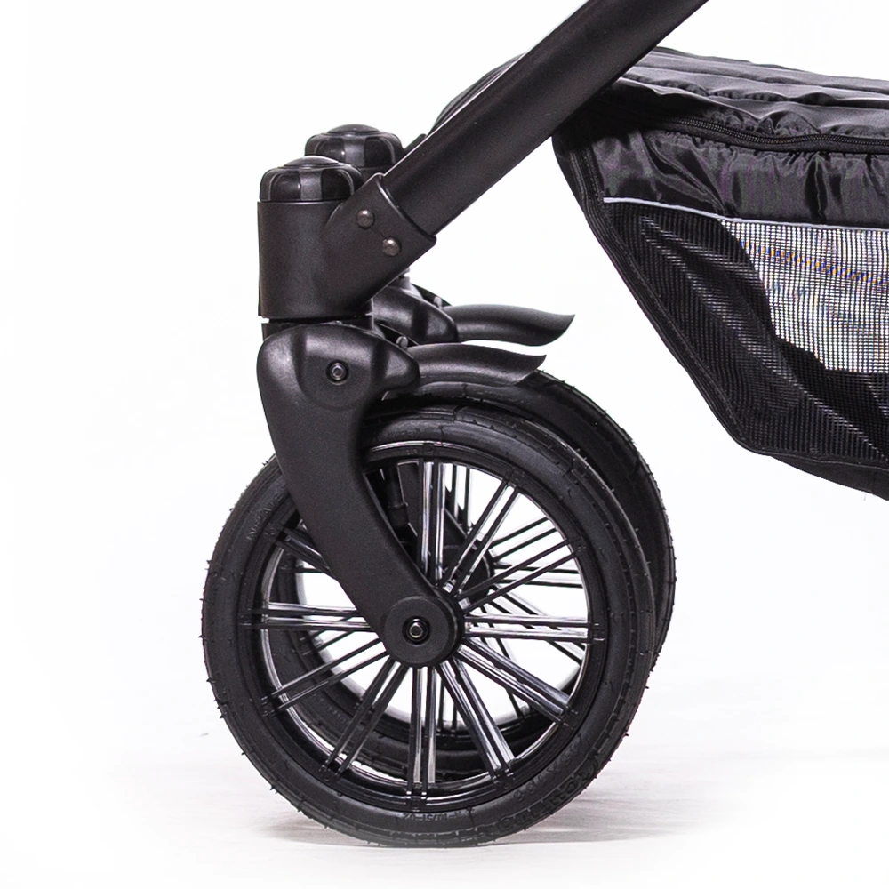 In der Stadt und auf ebenen Wegen überzeugt dieser Kinderwagen mit seiner Wendigkeit. Die 360° schwenkbaren Vorderräder können bei Bedarf festgestellt werden, und die Federung an der Hinterachse sorgt für eine ruhige und komfortable Fahrt.