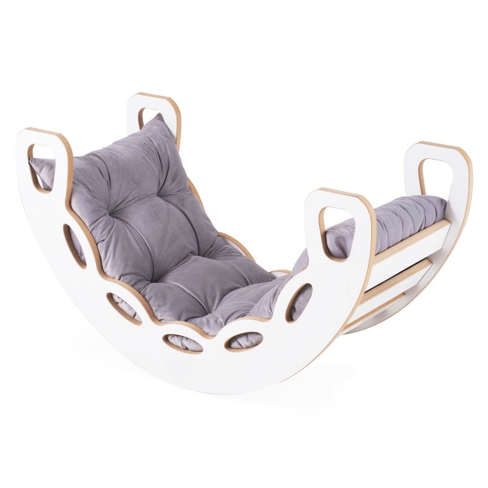 Produktinformationen "PLUSH NEST Kleines Schaukelpferd 4-in-1 Schaukelpferd + Kletterwand/Rutsche + Kissen (Samtgrau), weißes Holzspielgerät "