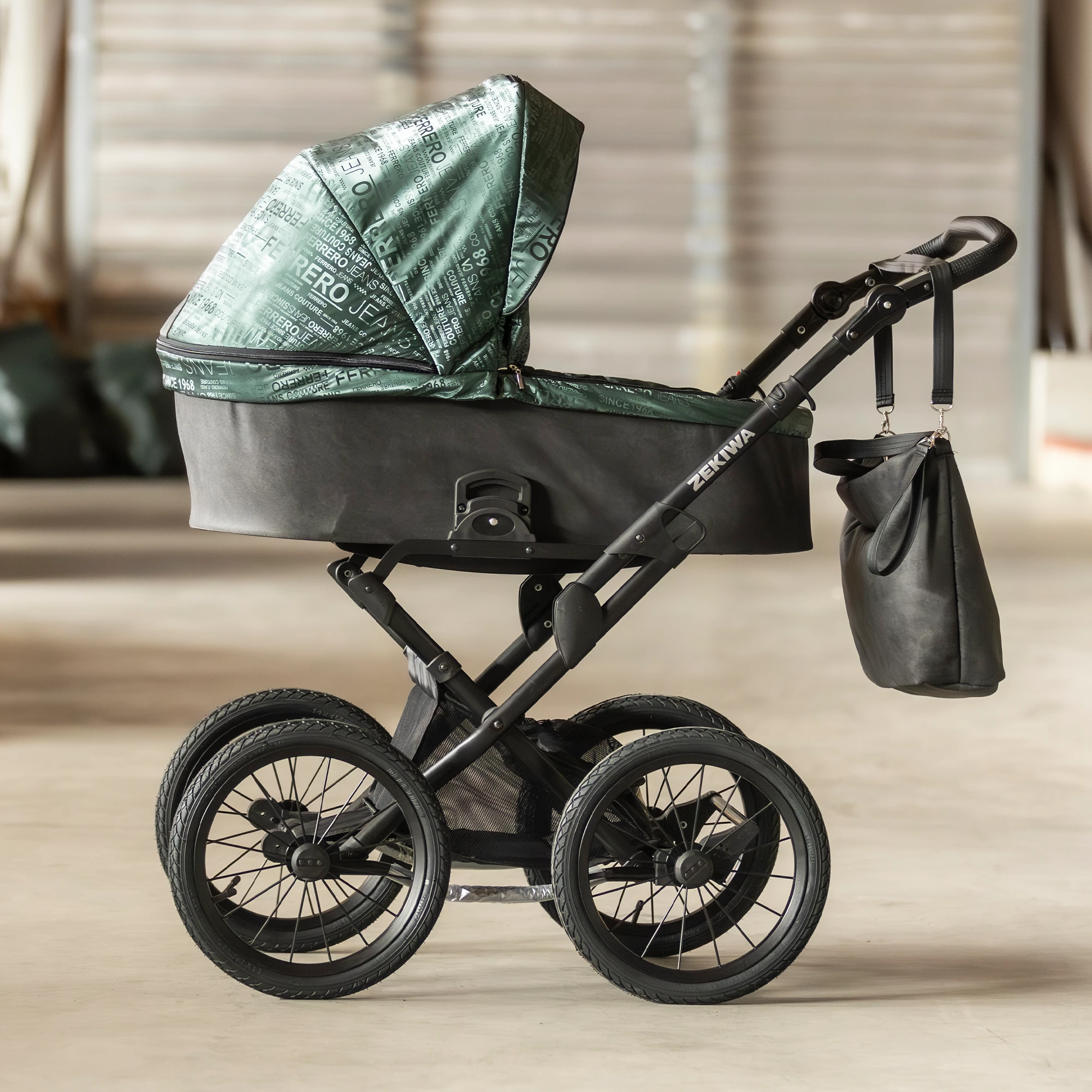 Der ZEKIWA Fero ist ein außergewöhnlicher Kinderwagen für Eltern, die das Besondere suchen. Dieses Modell ist ein Einzelstück und überzeugt durch seine leicht glänzende grüne Farbgebung sowie eine extravagante Schrift auf dem Verdeck, die dem Kinderwagen einen einzigartigen Charakter verleiht.