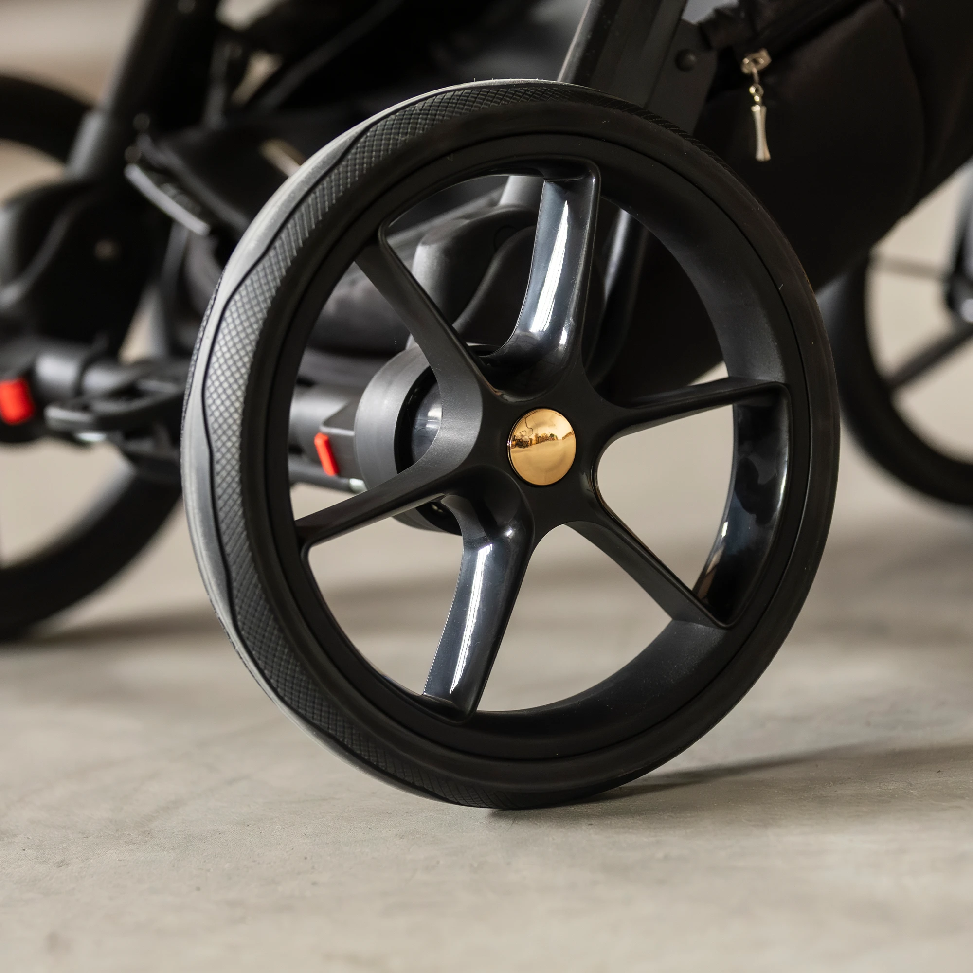 Die großen Gelräder sorgen für eine pannensichere und ruhige Fahrt. Die vorderen 10-Zoll-Schwenkräder sind feststellbar und ermöglichen ein einfaches Manövrieren, während die 12-Zoll-Hinterräder zusätzliche Stabilität bieten.