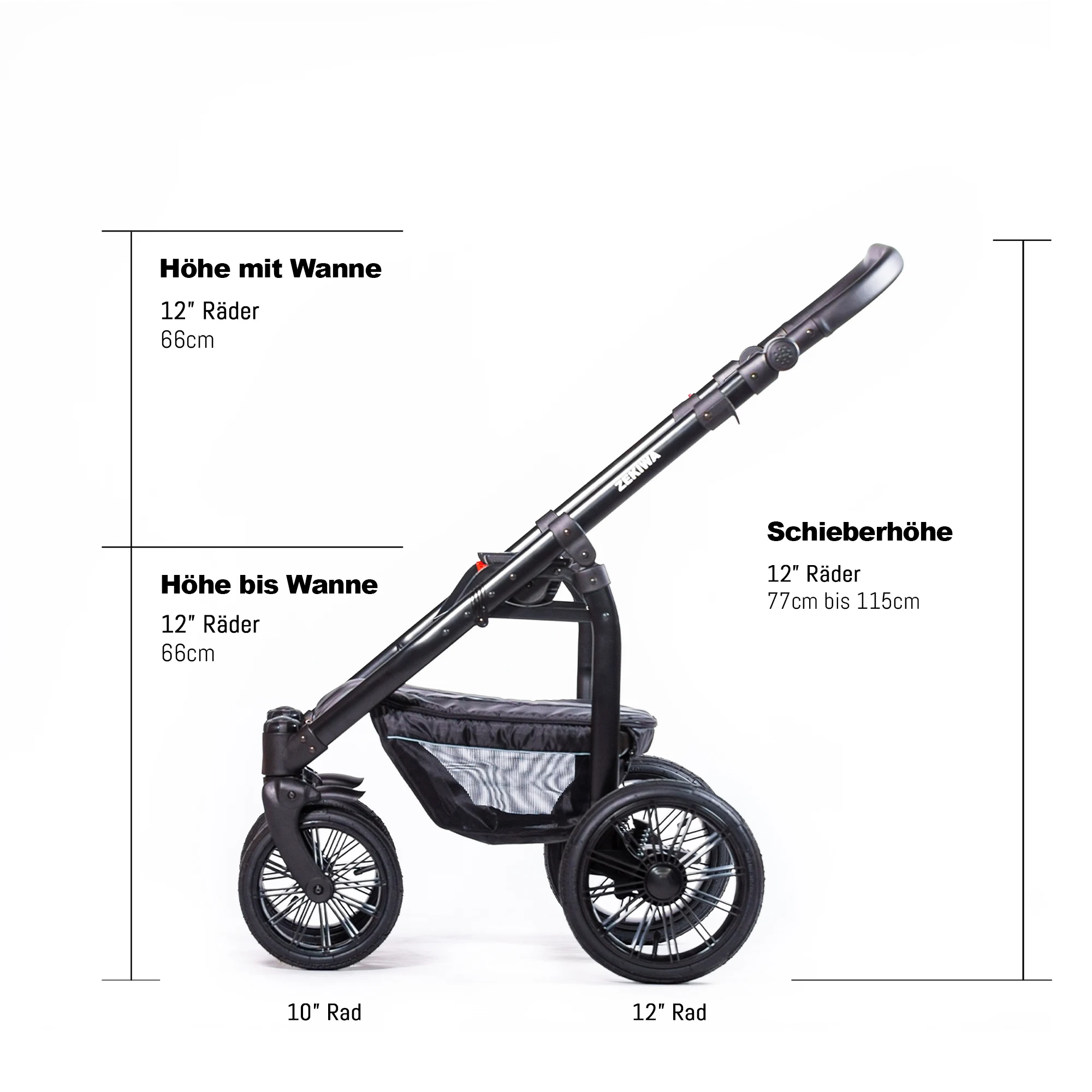 Luft- oder Gelrad (pannenfrei): 12-Zoll Räder, kugelgelagert für eine reibungslose Fahrt.