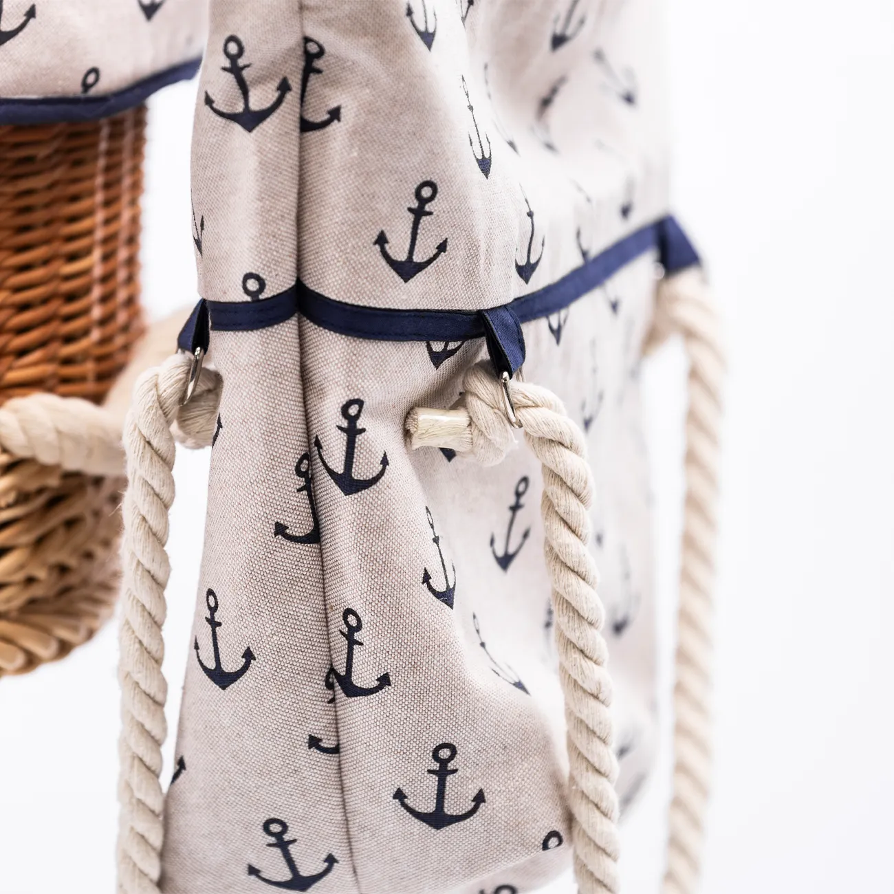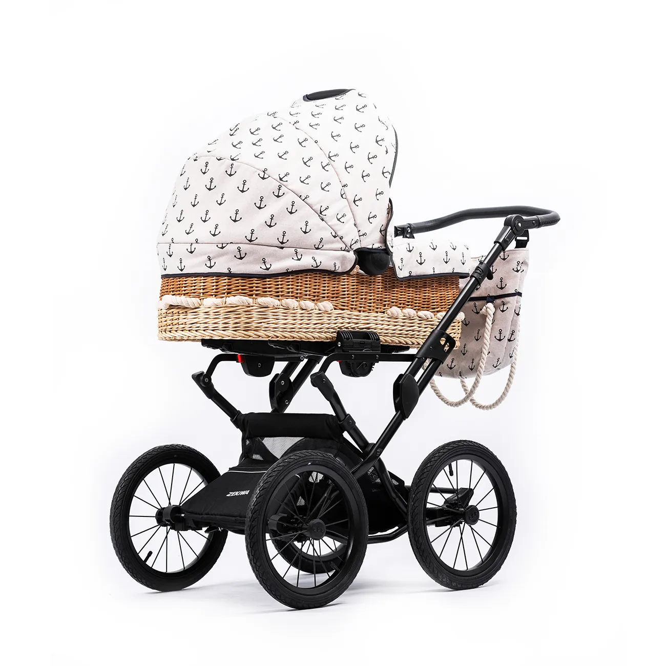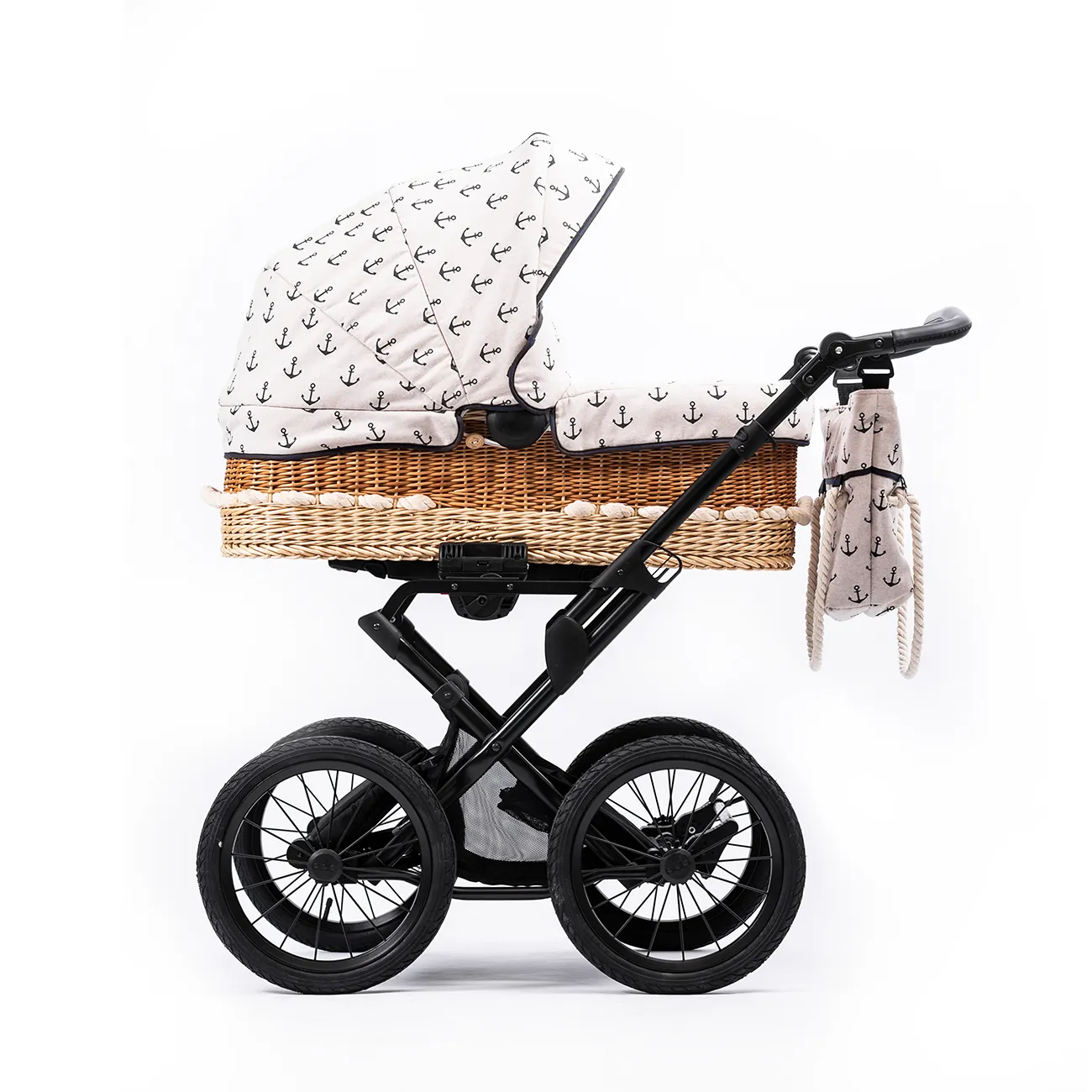 Produktinformationen "Korbkinderwagen "Litus" - Anker- Handgefertigt aus 100% Naturweide, mit 81 cm großer Liegefläche, Lederriemenfederung und Wickeltasche"