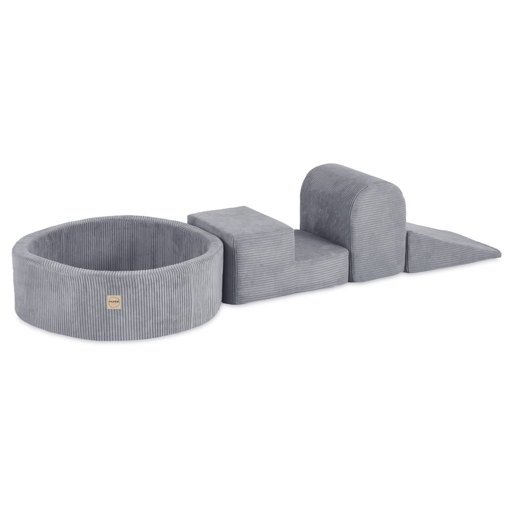 PLUSH NEST Spielplatz 3-teilig + Trockenbecken 90×30 (+200 Bälle: Perlmutt, Silber, Hellblau), Grau, Premium-Cord