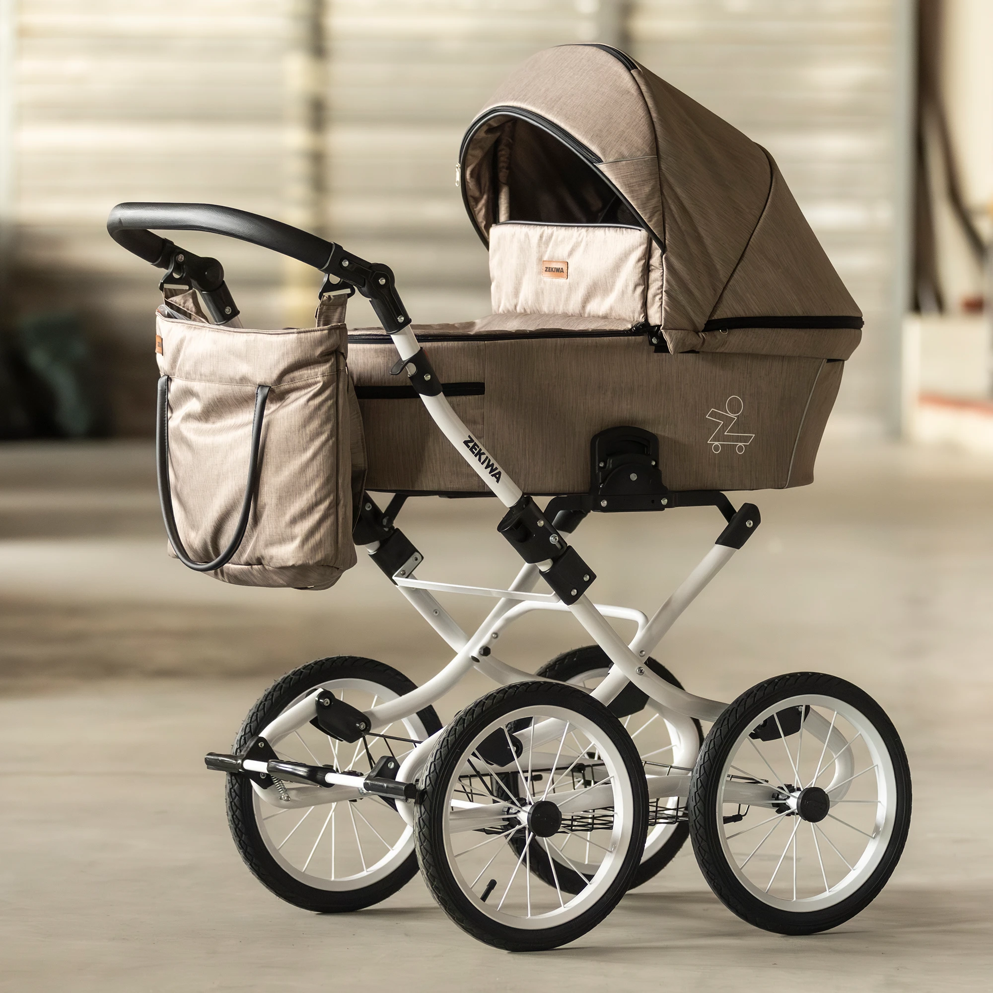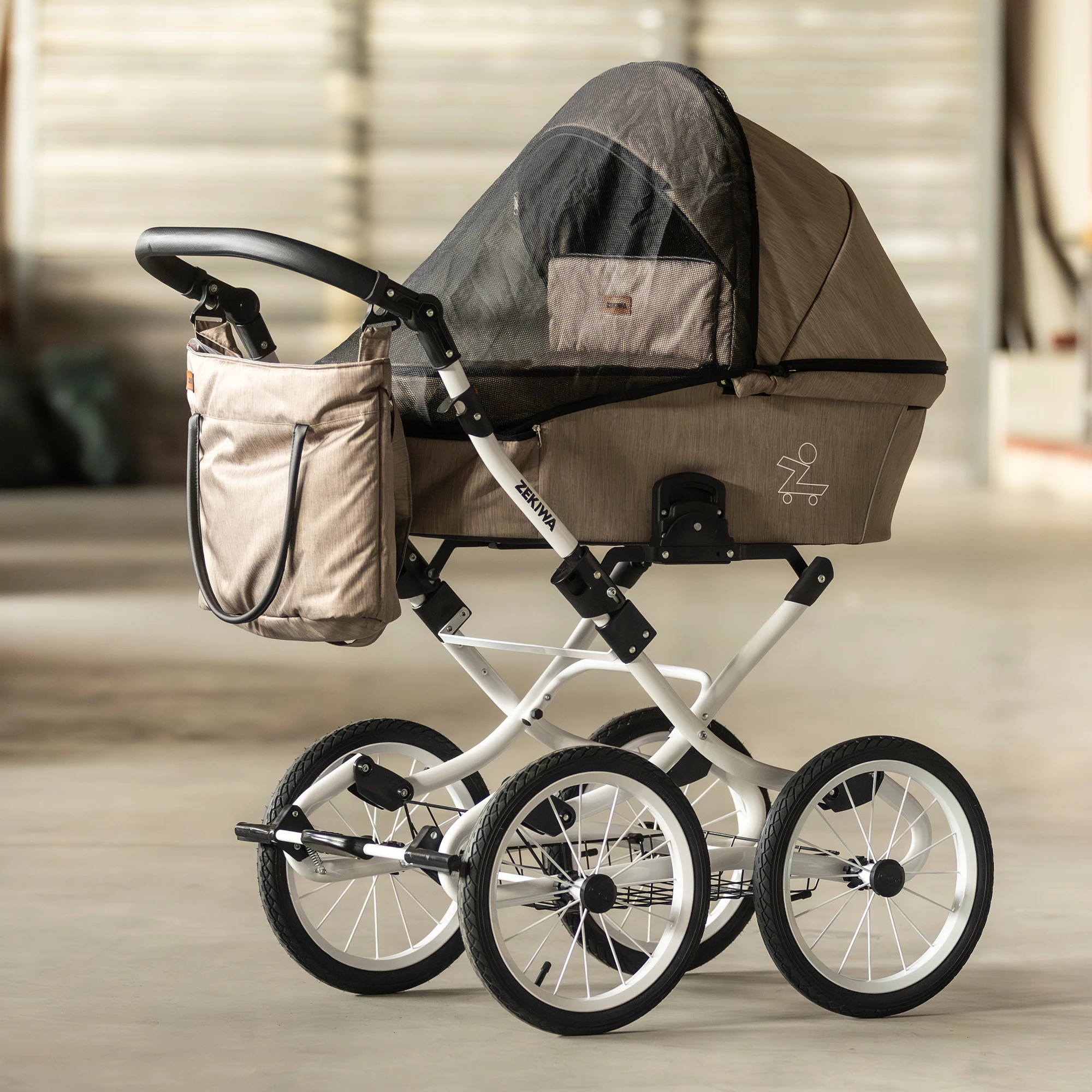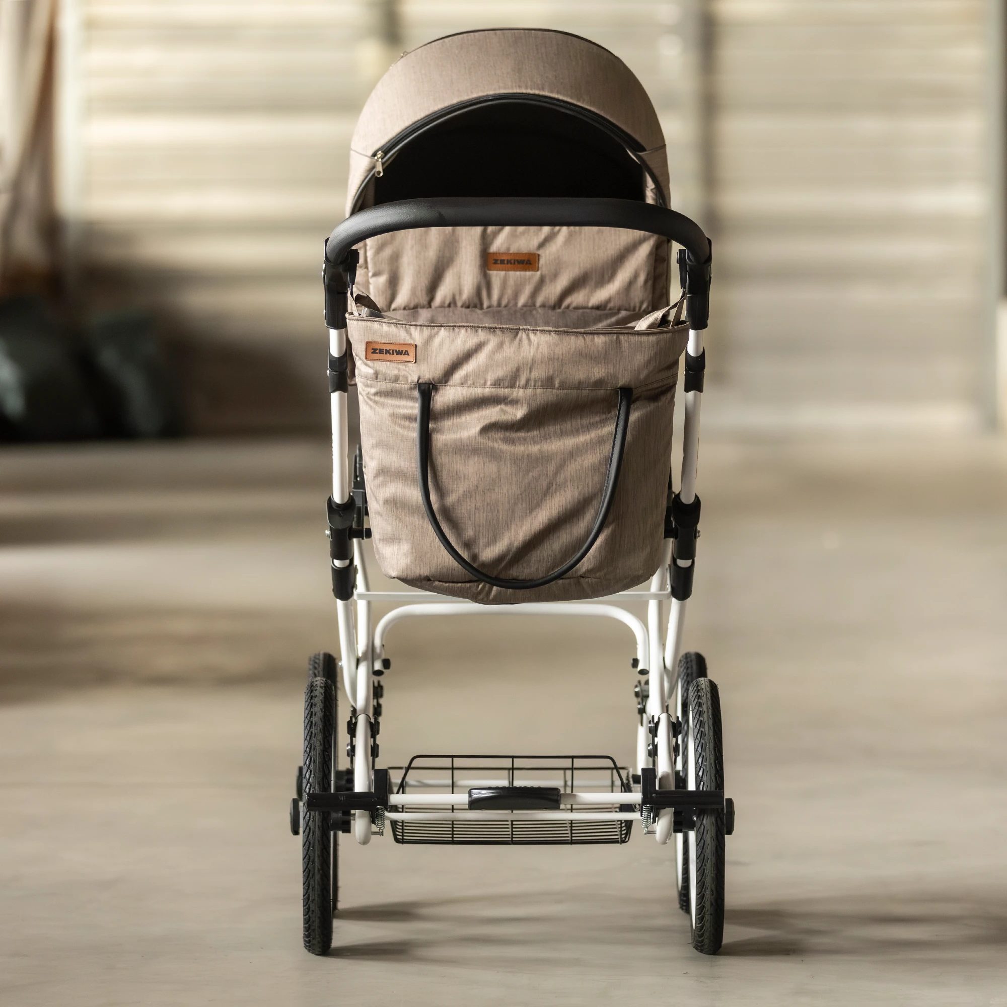 Das weiße Gestell des ZEKIWA Touring Galant verbindet klassische Stabilität mit zeitloser Eleganz. Die großen Räder sorgen für ein angenehmes Fahrverhalten und machen den Kinderwagen zu einem zuverlässigen Begleiter auf verschiedenen Untergründen. So profitieren Eltern und Kind gleichermaßen von ruhigen Fahreigenschaften und bewährtem Komfort.